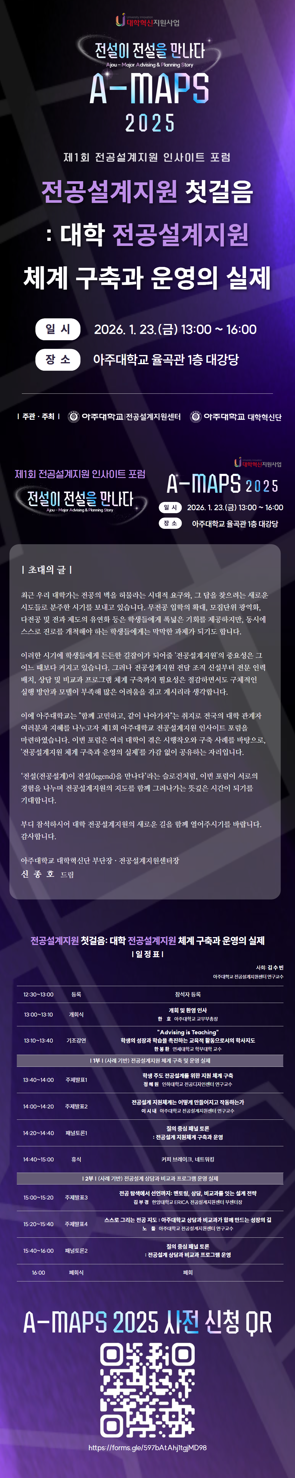 아주대학교 전공설계지원센터에서 전공 설계 지원 관련 노하우를 공유하고 시사점을 논의하기 위한 인사이트 포럼 ‘A-MAPS 2025’를 개최하고자 합니다. 귀 대학의 전공 설계 담당자를 포함하여 관심있는 구성원이 참석할 수 있도록 안내하여 주시기 바랍니다. 가. 주제: 전공설계지원 첫걸음: 대학 전공설계지원 체계 구축과 운영의 실제 나. 일시: 2026. 1. 23(금) 12:30 ~ 16:00 다. 장소: 아주대학교 율곡관 1층 대강당 라. 내용: 전공설계를 주제로 한 강연, 발표, 패널토론(붙임1 포스터 참조)