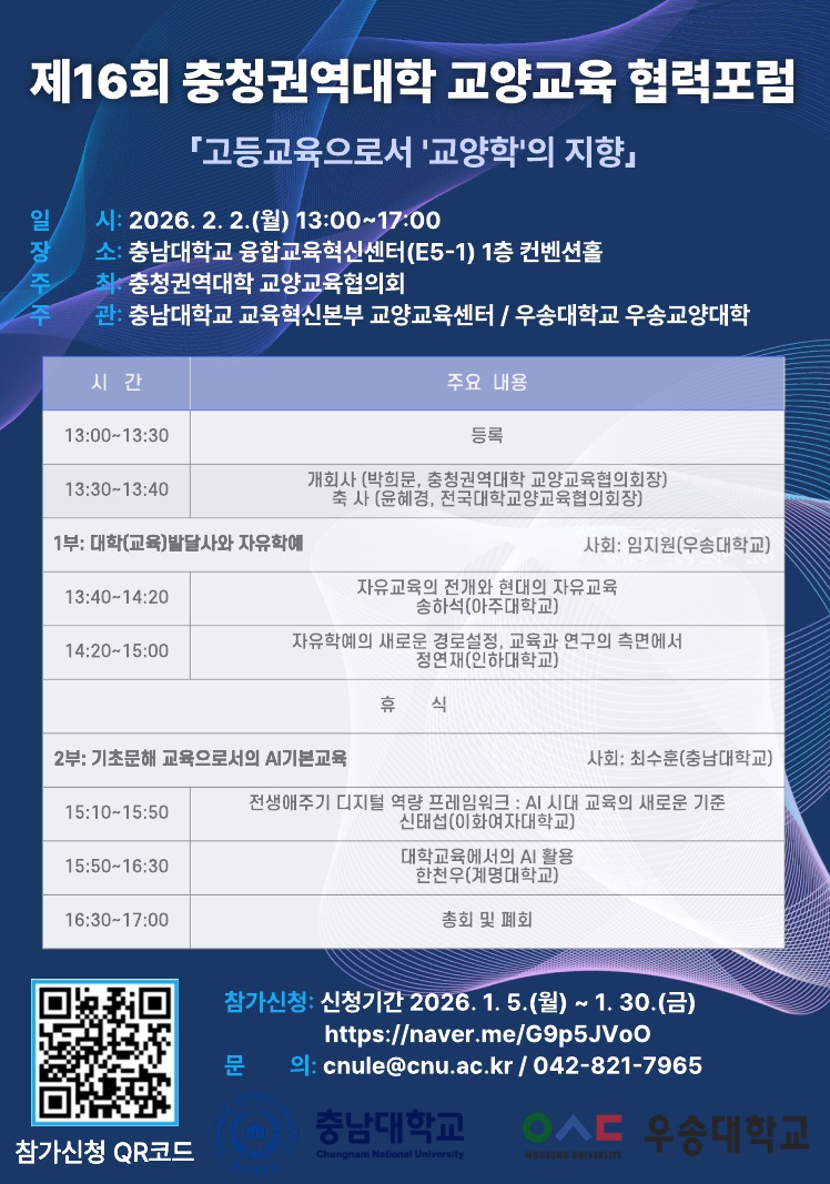 1. 행사명: 제16회 충청권역대학 교양교육 협력포럼 2. 주제: 고등교육으로서 ‘교양학’의 지향 3. 일시: 2026년 2월 2일(월) 13:00~17:00 4. 장소: 충남대학교 융합교육혁신센터(E5-1) 1층 컨벤션홀 5. 참여대상: 충청권역대학 교양교육 담당 기관장 및 실무자 등 6. 참여신청: https://naver.me/G9p5JVoO [참여신청 기간: 2026. 1. 5.(월)~2026. 1. 30.(금)] 7. 문의: 교육혁신본부 교양교육센터(042-821-7965/cnule@cnu.ac.kr)