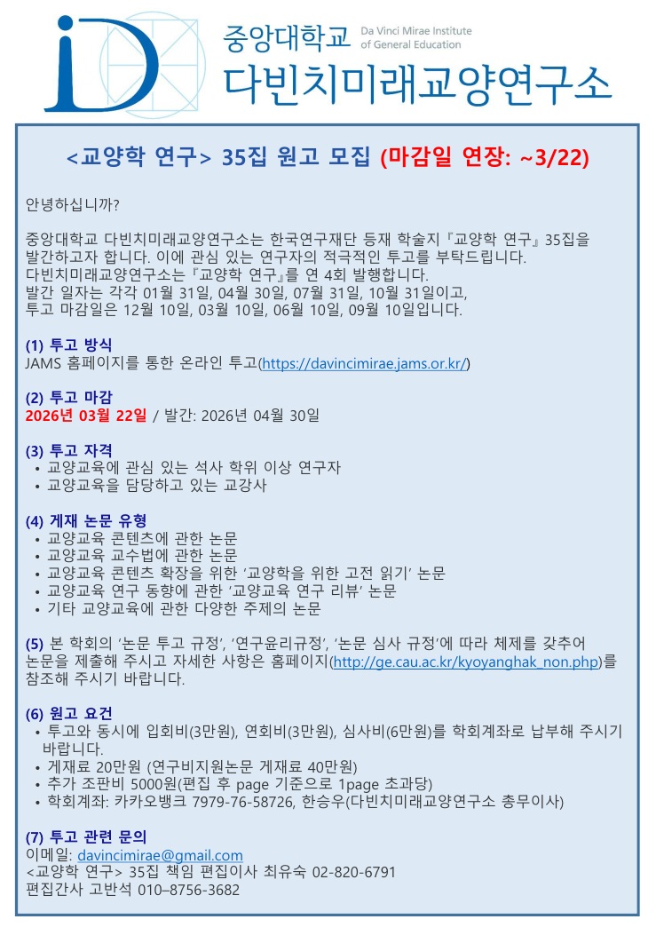 | [중앙대학교] 다빈치미래교양연구소 <교양학 연구> 35집 원고 모집 안내 (마감일 연장: ~3.22.) | 2026-02-10 조회수 : 302 |