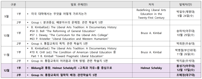 2025 한국교양기초교육원 "세미나21:대학의 역사" 12월 모임 안내“세미나21:대학의 역사”는 한국교양기초교육원 지원 월례 학술모임입니다. 2021년부터 고대 그리스로부터 중세를 거쳐 초기 근대까지 대학의 기원과 발생에 대해 세미나를 진행하였습니다. 2025년 12월에는 다음과 같은 주제로 세미나를 진행할 예정이니 관심 있는 분들의 참여를 기대합니다. <2025년 하반기 "세미나21:대학의 역사"발제 계획>